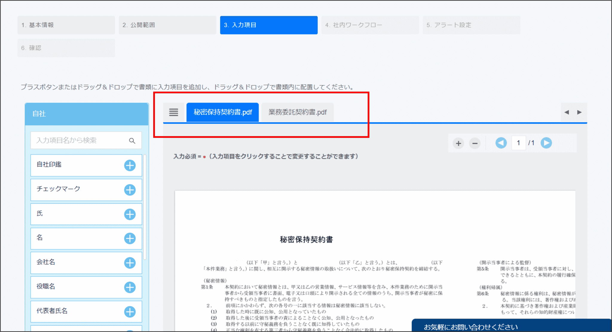 テンプレート設定画面で複数のファイルがアップロードでき、ファイルごとに必要な入力項目を設定可能です。