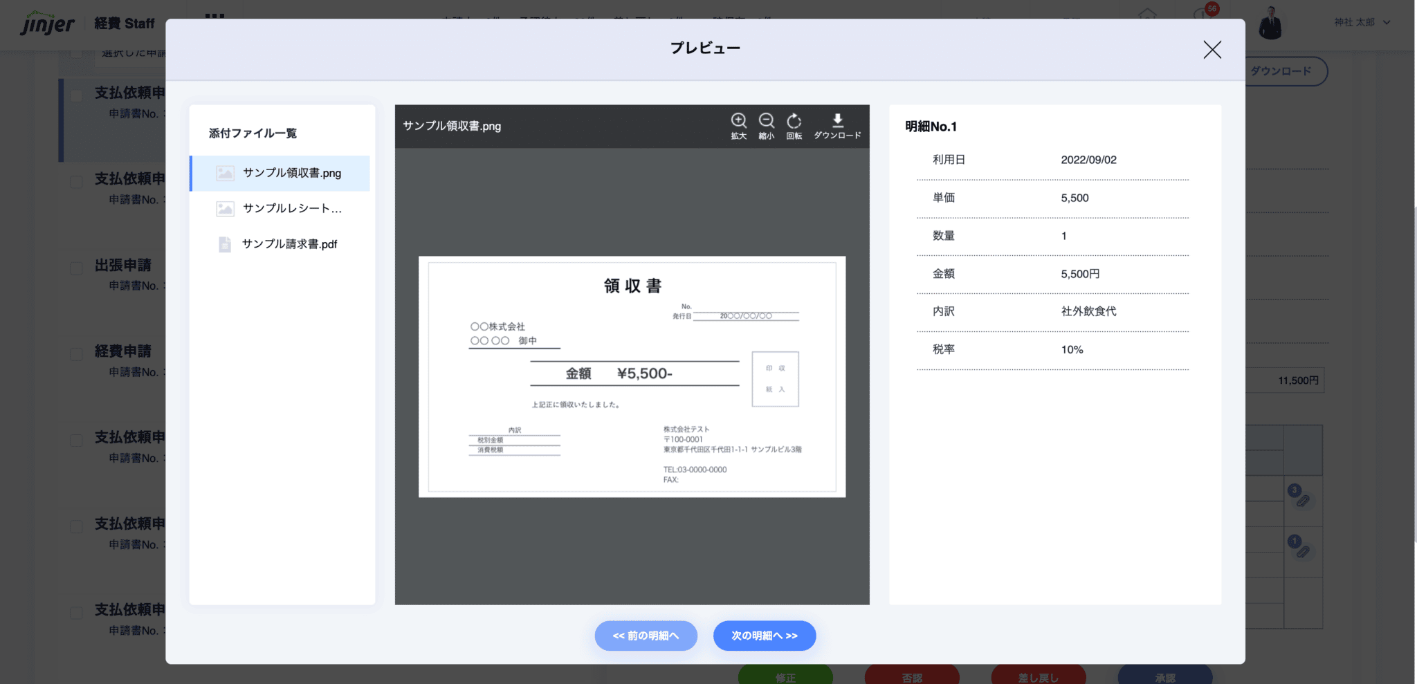 ファイルのプレビュー表示の左位置に、明細に添付されているファイルの一覧が表示され、ファイルのプレビュー表示の右位置に、明細の登録情報が表示されます。