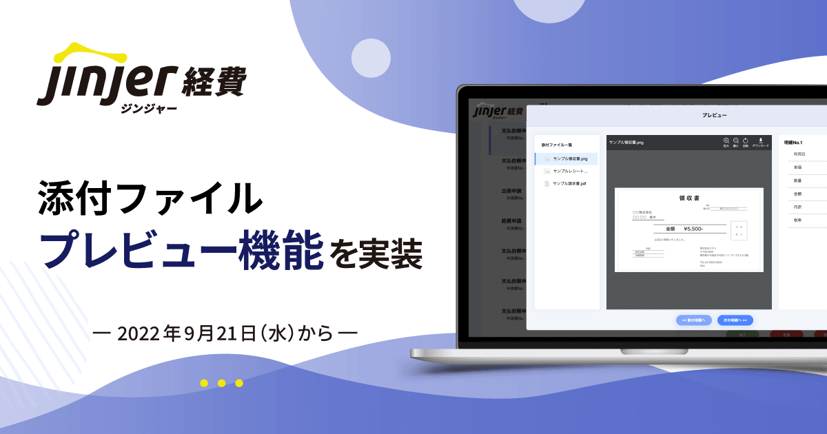 jinjer株式会社(本社:東京都新宿区、代表取締役CEO:加藤 賢、以下jinjer)が提供する、バックオフィス向けクラウドサービス「ジンジャー経費」に、管理画面上で領収書等の登録画像が確認できるプレビュー機能を2022年9月21日(水)から実装することをお知らせいたします。