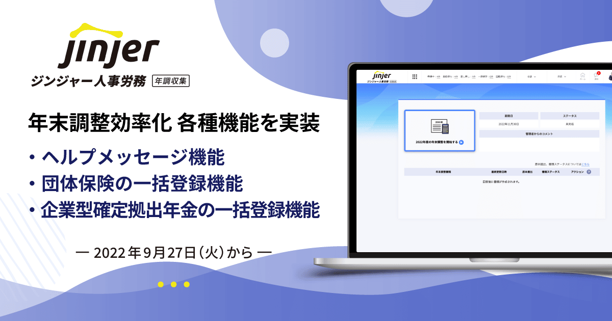 • jinjer株式会社(本社:東京都新宿区、代表取締役CEO:加藤 賢、以下jinjer)が提供する、バックオフィス向けクラウドサービス「ジンジャー人事労務 年調収集」に、年末調整の業務効率化を実現する各種機能(ヘルプメッセージ機能・団体保険の一括登録機能・企業型確定拠出年金の一括登録機能機能)を2022年9月27日(火)から実装することをお知らせいたします。