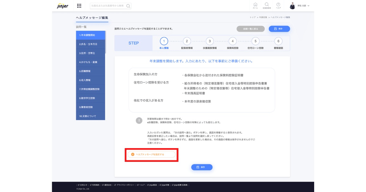 年調収集の従業員回答画面にて回答の補助となるヘルプメッセージを設問毎に設定できます。これにより、従業員がヘルプメッセージを見ながら、アンケート回答を迷わずにおこなうことができ、スムーズな年末調整書類の作成が可能となります。