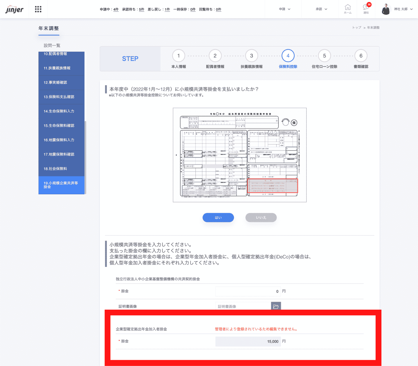 年調収集のアンケート回答依頼前に団体保険を管理者側で一括で登録できるようになりました。登録した保険料は、従業員の回答画面へ反映することが可能です。