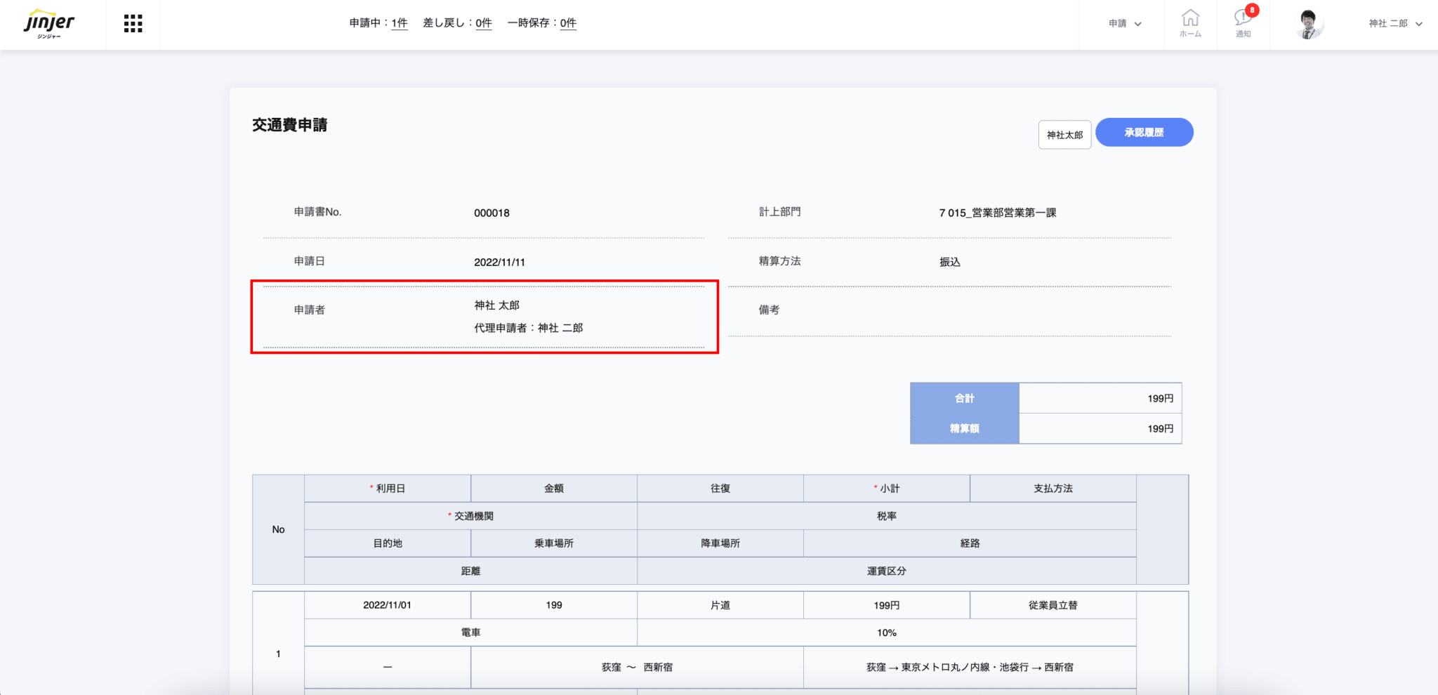 ▶申請者欄に代理申請者として、本来の申請者の下に代理申請者名が記載されます。