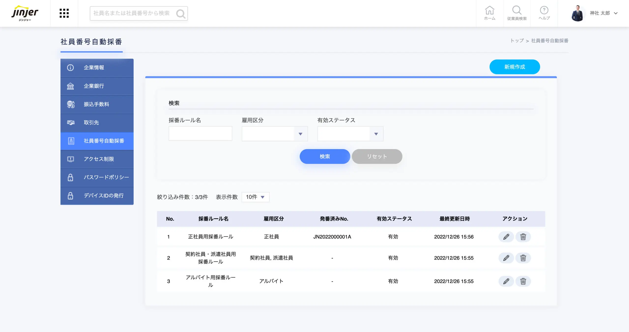 ▶社員番号自動採番画面では、企業ごとに作成されている自動採番ルールを一覧で確認することができます。