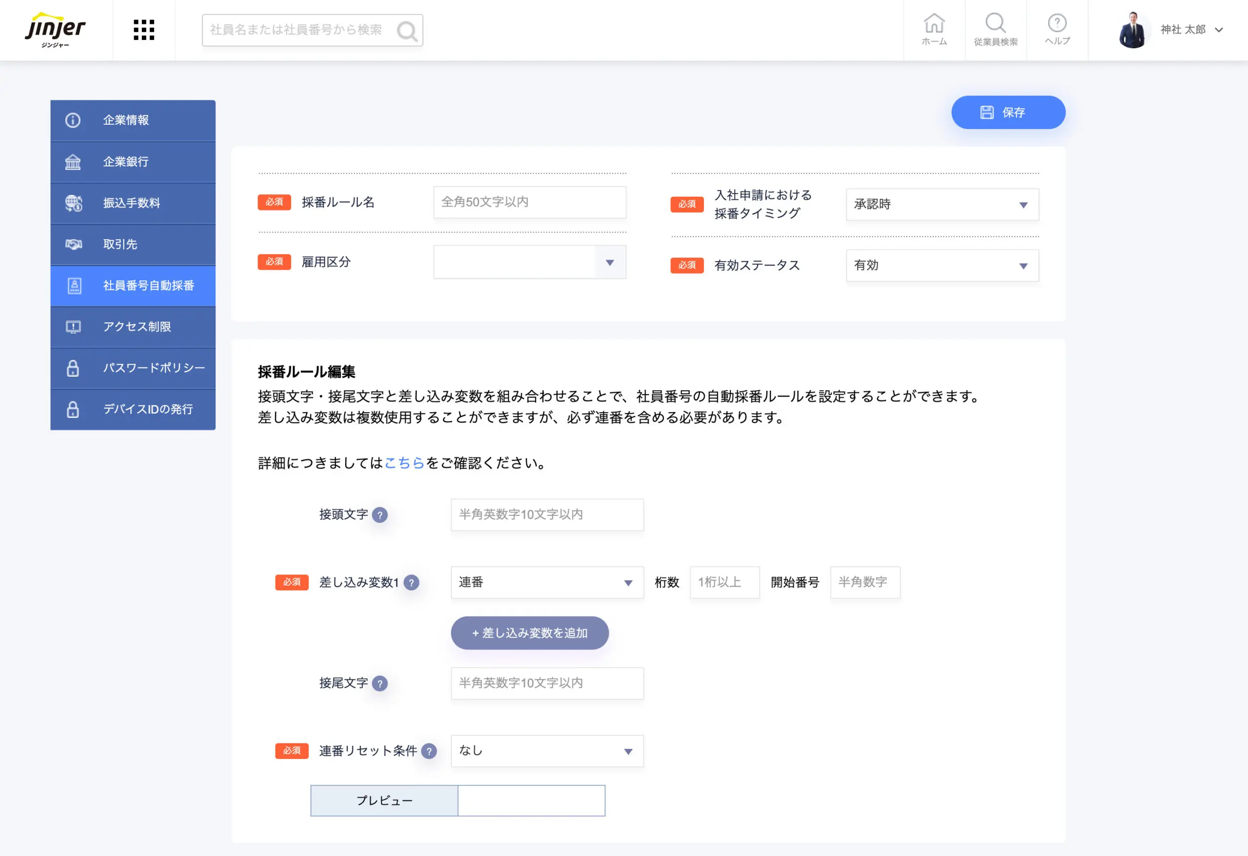 ▶社員番号は、接頭文字・接尾文字と、4種類の差し込み変数を組み合わせて採番できます。