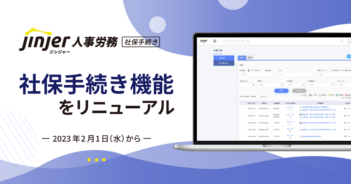 jinjer株式会社(本社:東京都新宿区、代表取締役CEO:加藤 賢)が提供する、バックオフィス向けクラウドサービス「ジンジャー人事労務 社保手続き」機能を2023年2月1日(水)にリニューアルしたことをお知らせします。