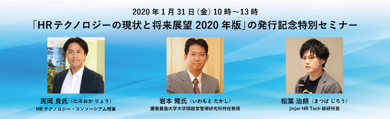 本セミナーでは、出版元の株式会社シード・プランニング及び「HRテクノロジーの現状と将来展望2020年版」の共同制作者で、「HRテクノロジー・コンソーシアム」の理事も務める人事ソリューション・エヴァンジェリスト民岡 良氏による市場調査レポートの解説を行います。また、ゲストとして日本におけるHRテクノロジーの第一人者である岩本 隆氏と、「ジンジャー HR Tech総研」所長の松葉 治朗が講演を行います。
