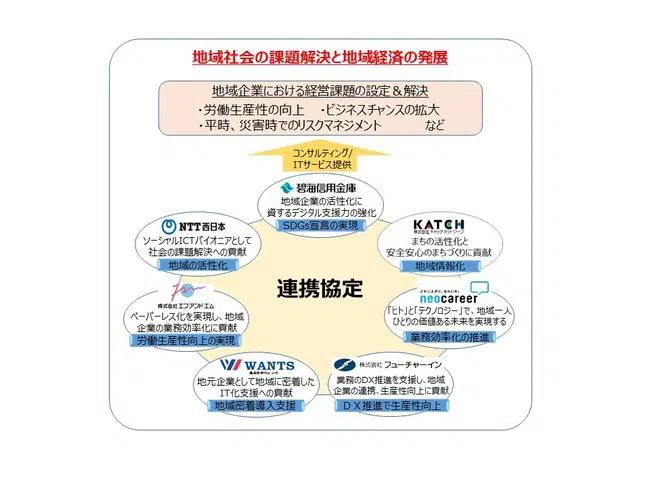 この度、人事クラウドサービス「ジンジャー」を提供する株式会社ネオキャリア(本社:東京都新宿区、代表取締役:西澤亮一)は、碧海信用金庫(理事長 山内 正幸)と西日本電信電話株式会社 東海事業本部(取締役東海事業本部長 安部 真弘、以下「NTT西日本」)、株式会社キャッチネットワーク(代表取締役社長 松永 光司、以下「キャッチネットワーク」)、株式会社エフアンドエム(代表取締役社長 森中 一郎、以下「エフアンドエム」)、株式会社ウォンツ(代表取締役社長 石川 清和、以下「ウォンツ」)、株式会社フューチャーイン(代表取締役社長 伊藤 利英、以下「フューチャーイン」)で、各々が持つ経営資源やノウハウの強みを連携させ、中小企業等の経営課題解決に向けたデジタル化を支援し、地域社会や経済の活性化と、SDGs(※)の達成に貢献することを目的に、次のとおり連携協定を締結いたしました。