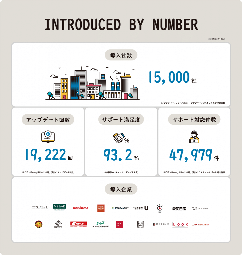 「ジンジャー」は、サービス開始からこれまでに、のべ導入社数15,000社を突破しました。2016年から開始したサービス展開も、今では勤怠管理から人事管理、電子契約に至るまでバックオフィスの幅広い業務をカバーできる範囲に広がっています。アップデート回数は、ユーザーの要望や法改正等の対応で、リリース以降、累計で19,222回を記録。サポート満足度も93.2%と高い結果となっています。jinjerは、今後も顧客視点でのサービス開発を追求し、「バックオフィスの一番そばに」という理念のもと、皆様の業務を最前線で支えていきたいと考えております。