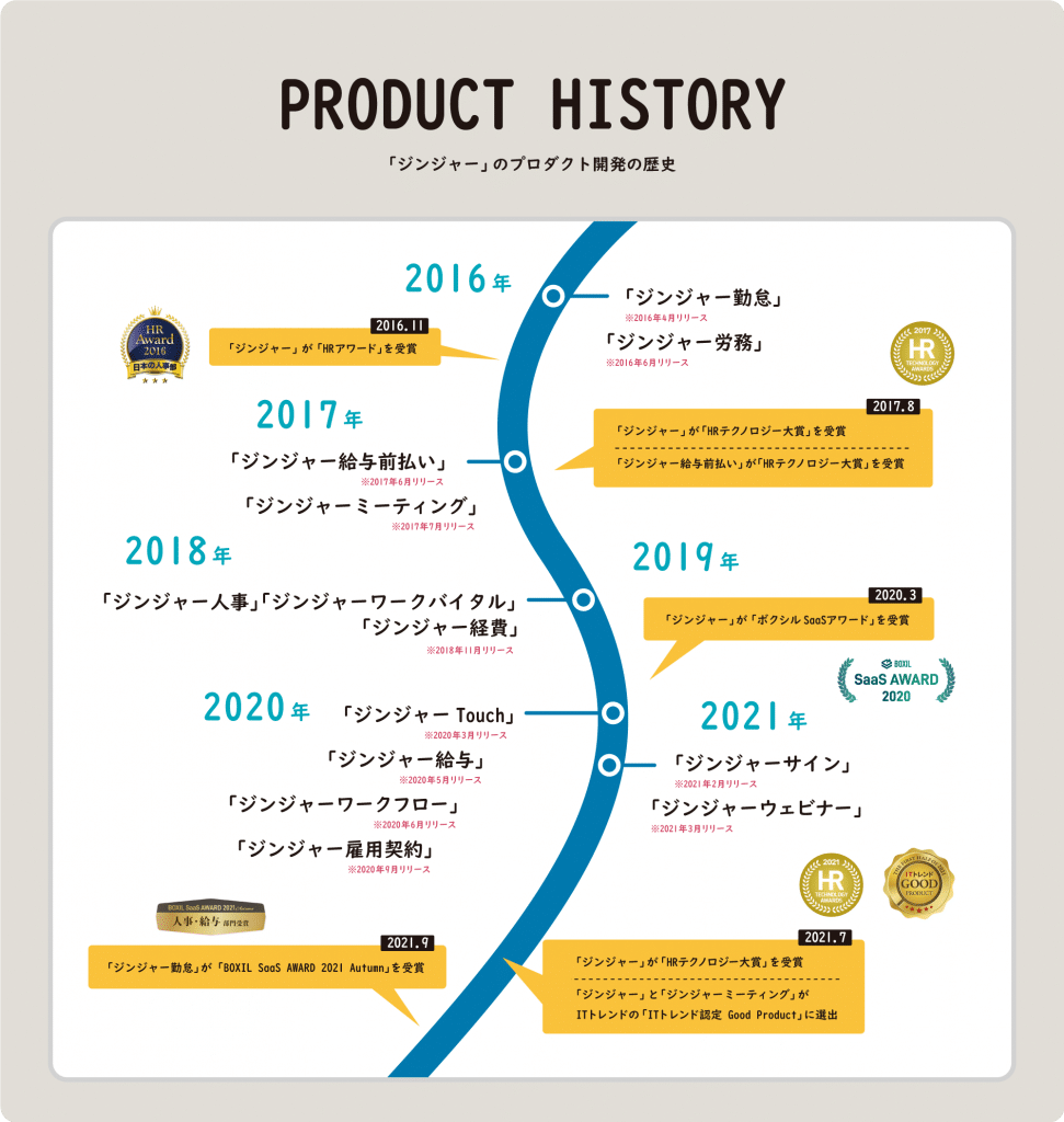 日頃の皆様からのご支援とご愛顧もあり、この6年間で、「ジンジャー」シリーズは、「勤怠管理」「労務管理」「給与前払い」「Web会議」「人事管理」「ワークバイタル」「経費精算」「給与計算」「ワークフロー」「雇用契約」「電子契約」「ウェビナー機能」など12のサービスをリリースし、多くのユーザーへ現在提供中です。また、この間、「ジンジャー」シリーズは、「HRアワード」や、「HRテクノロジーアワード」を受賞するなど高く評価されています。2022年度中も複数のサービスリリースを検討しており、バックオフィス向けクラウドサービスとして、更なる機能向上を図って参ります。