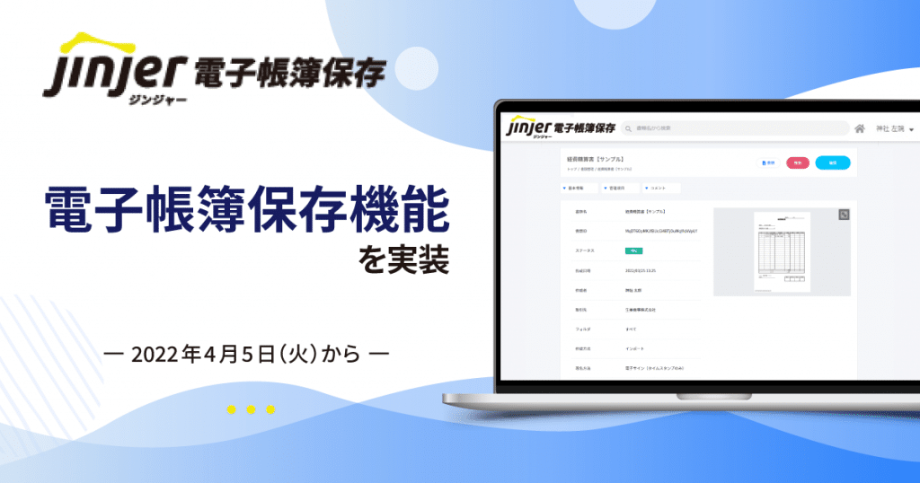 jinjer株式会社(本社:東京都新宿区、代表取締役CEO:加藤 賢)が提供する、バックオフィス向けクラウドサービス「ジンジャー」に、「電子帳簿保存機能」を4月5日(火)から正式に実装することをお知らせいたします。